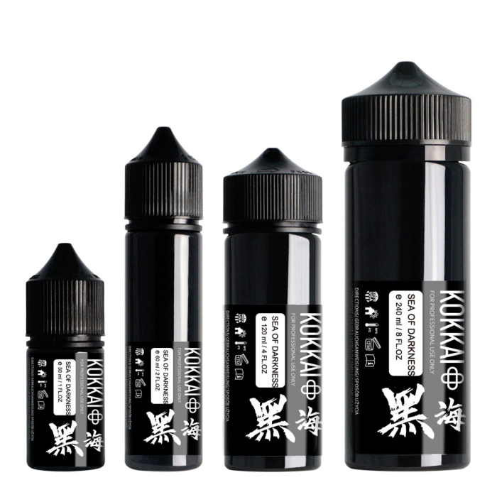 Achieve dramatic black tones with Kokkai Sumi Ink in Sea of Darkness, a deep, rich black perfect for shading, outlining, and filling. Ideal for blackwork, blackout, and black and grey tattoos.