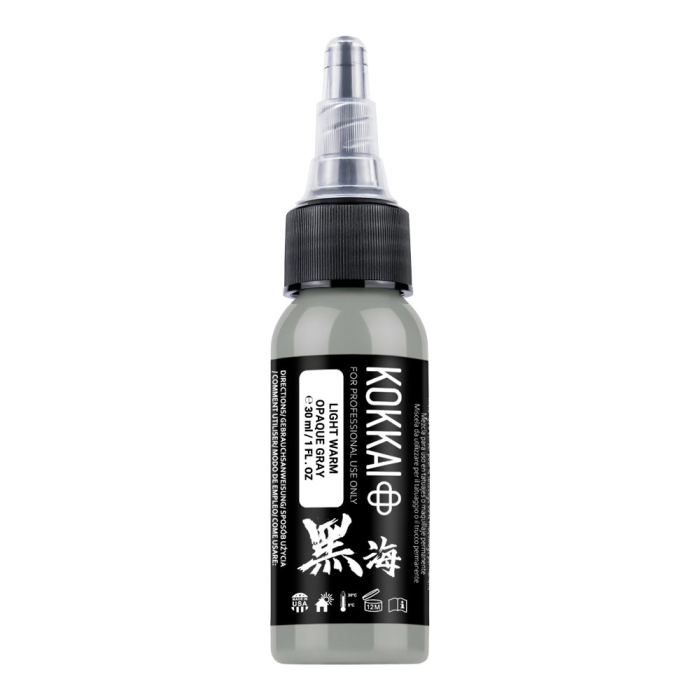 Enhance tattoos with Kokkai Sumi Ink in Light Warm Opaque Grey, part of a 5-shade set designed to bring depth, warmth, and softness to your tattoos. Infused with white for a creamy opaque finish, these warm-toned greys are perfect for portraits, realism, black and grey work, and organic elements in designs.