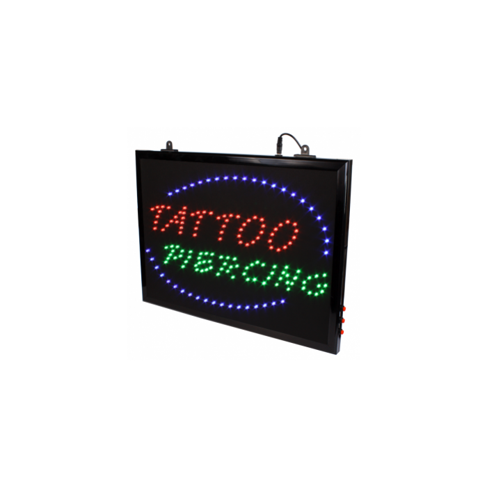 TATTOO og PIERCING LED skiltet kan henges opp i studio vinduet for å gi studioet den lille ekstra autentiske touchen. Kommer komplett med kjede og kan plugges rett i stikk kontakten med ledningen på ca 1900mm. Skiltet kommer med fire forskjellige innstillinger: