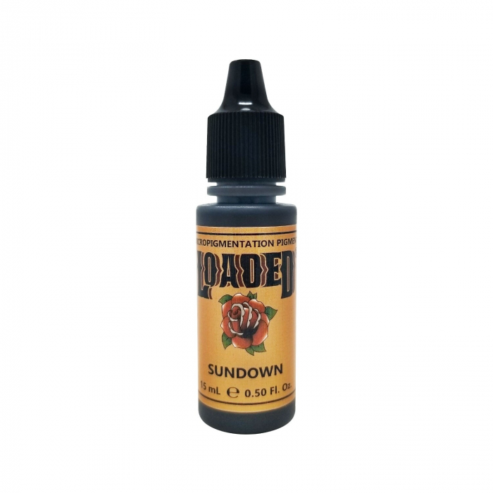 Loaded by Li Pigments - Sundown er en mørk sort/brun farve og den mørkeste farvetone i Loaded line up. Vil heles til et medium sort på de fleste hudtyper.