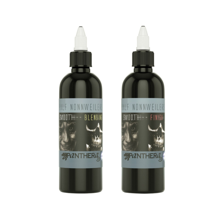 Smooth Finish-settet er et blekk i to flasker fra Panthera Ink i samarbeid med den verdensberømte tatoveringsartisten Ralf Nonnweiler. Samsvarer nå med de siste EU REACH-forskriftene