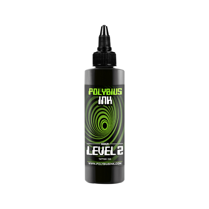 Medium Level 2 fra Polybius Ink er et middels grått tatoveringsblekk som er perfekt for overganger mellom lyse og mørke områder. Det kan brukes alene eller fortynnet med nivå 0.
