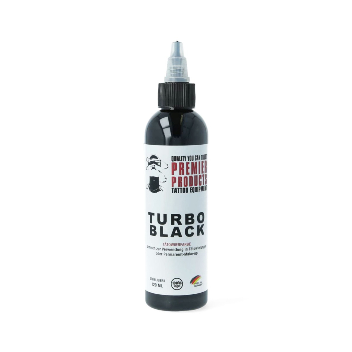 Turbo Black er det mørkeste svarte tatoveringsblekk som tilbys av Premier Products. Enkel å bruke og vil sikre at den ferdige tatoveringen forblir solid og svart.