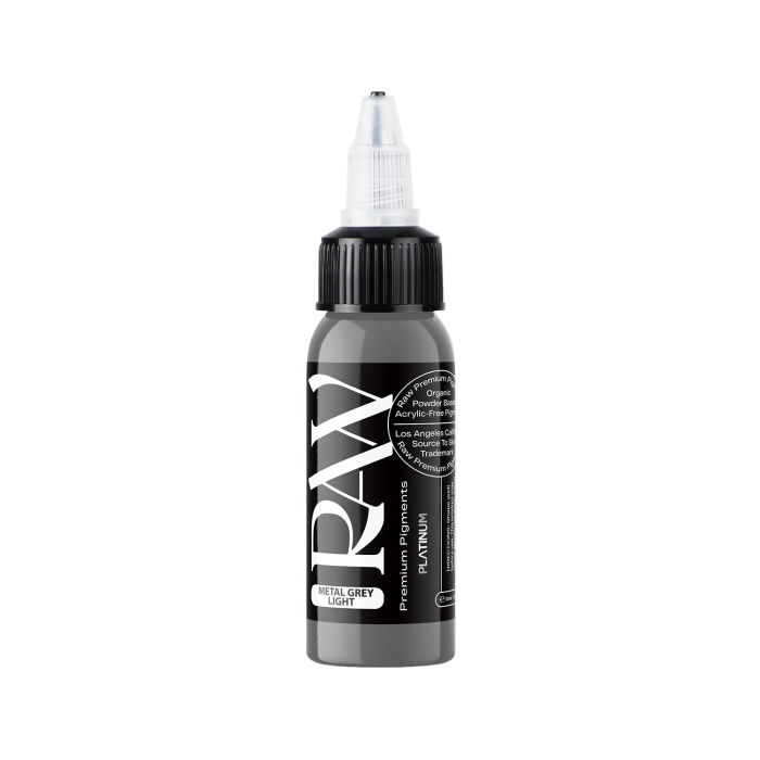 Metal Grey Light er et veldig mykt grått tatoveringsblekk som kan gjøres lysere eller mørkere og går lett inn i huden, fra Raw Premium Pigments' EU REACH-kompatible Platinum-serie.