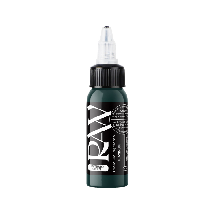 Phthalo Green er et dypt, mørkegrønt tatoveringsblekk fra Raw Premium Pigments' EU REACH-kompatible Platinum-serie.